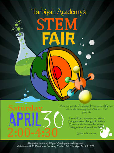 Tarbiyah Academy is proud to host it's very first STEM Fair! Join us for a fun and educational event with many hands on activities encouraging your child to learn about Science, Technology, Engineering, and Math. Bring an extra change of clothes for messy activities, and if you have some winter gloves, bring them to use as well.