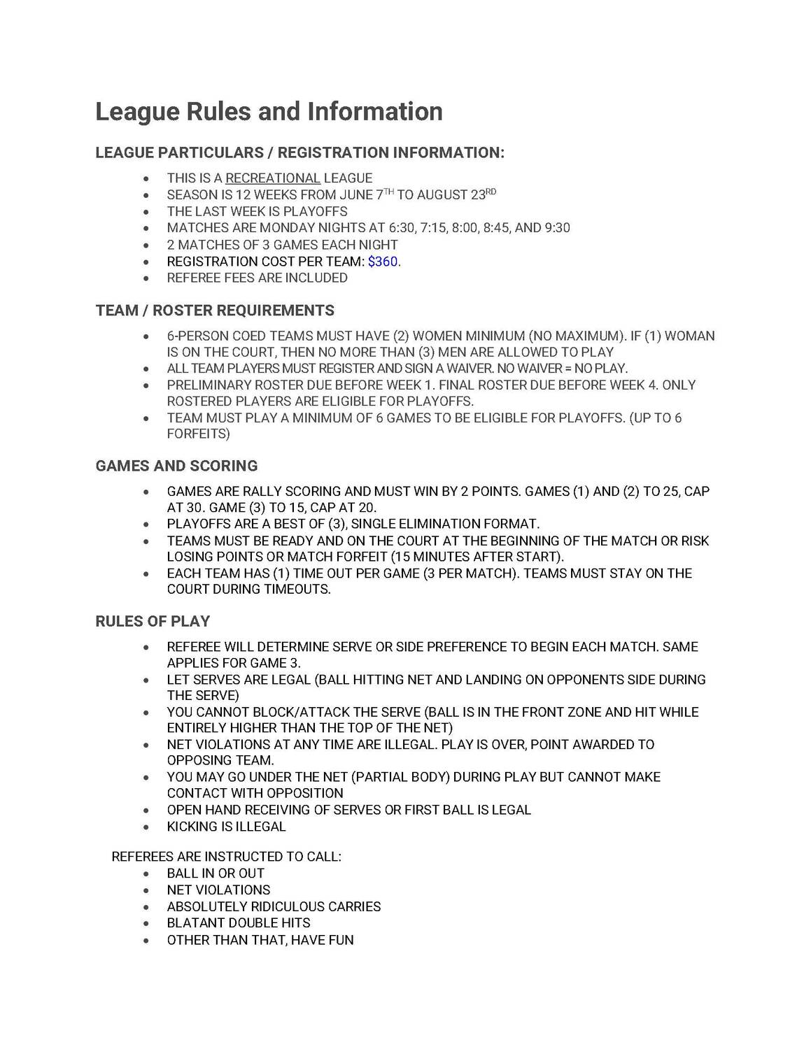 This is a recreation league. The rules are geared for beginners and casual play